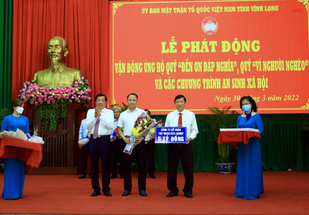 On March 30, 2022, KITA Group Investment and Real Estate Development Corporation donated VND 5 billion to build 100 gratitude houses in support of the “Gratitude and Remembrance” Fund, the “For the Poor” Fund, and social welfare programs launched by the Vinh Long Provincial Vietnam Fatherland Front Committee. Attending the event was Mr. Bui Van Nghiem, Member of the Party Central Committee and Secretary of the Vinh Long Provincial Party Committee.